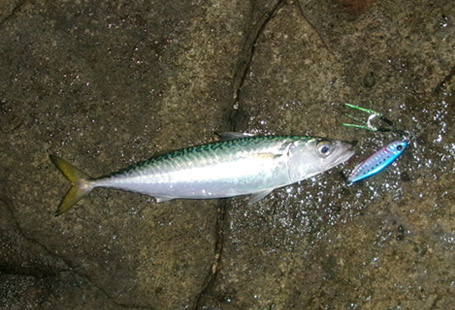 隣の磯へ移動すると、30cm弱のスマガツオが2匹上がっていた。