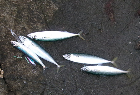 早朝の投げサビキの釣果は、サバ6匹とウルメ4匹