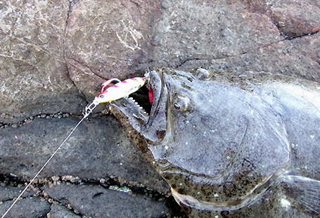 ■突然の大物 7時過ぎ、突然大物がヒット! その時の状況であるが… ジグが着底した後、わずかなアタリを感じたが、乗らなかった。 そこで、2〜3回、しゃくりを入れた。 すると、乗った〜 一体、何がヒットしたのだろう? リールを巻き始めると、強いヒキ これは、イナダだ!? 足元近くまで寄せると、凄い突っ込み これは、ワラサか!? やがて、海面に浮いてきた魚を見て、ビックリ そこには、どでかいヒラメがいた(◎_◎) 一か八か、いてまえ〜 全然持ち上がらず、足元の岩にぶつかった。 バレるなよ…祈りながら、ラインを持って、ずり上げた。 こうして、大きなヒラメをゲット〜(^o^)丿