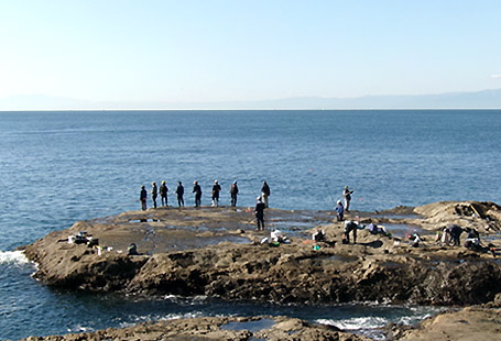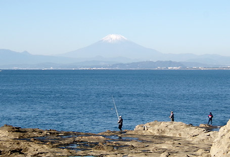 石段を上ったところから、釣り場を眺めていた。 すると、イナダが上がるのが目に入った。 釣り上げたのは、ベテランのIYさんだろうか… 直ぐその後、今度はHJさんが、イナダを上げた。 恐らく、この時が、ゴールデンタイムだったのだろう。 今日は、富士山がとても綺麗だった。