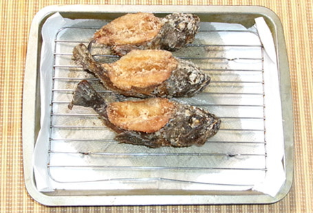■カサゴの丸揚げ 色々なレシピがあるが、どれも参考にならない。 カサゴの骨は硬くて、食べられたものではない。 私が今、参考にしているのは、こちらのレシピ https://osakana-outdoor.com/deep-fried-kasago/ ポイントは、以下の3点 1.中骨を抜くこと 2.頭を割ること 3.小型のカサゴを使うこと(15cm程度まで) そして、160℃の油で15分揚げる。 まるごとサクッといけるカサゴの唐揚げの完成だ。 1月3日、20cmアップのカサゴで、丸揚げを作った。 160℃の油で20分、更に180℃で5分、二度揚げした。 頭からかぶりついたら、頭が硬かった(泣) これで、小型のカサゴでないと、丸揚げは無理という結論に達した。 刺身にも煮付けにもならない小型のカサゴ もし、沢山釣れたら、丸揚げに挑戦してみては如何でしょう(^ε^)
